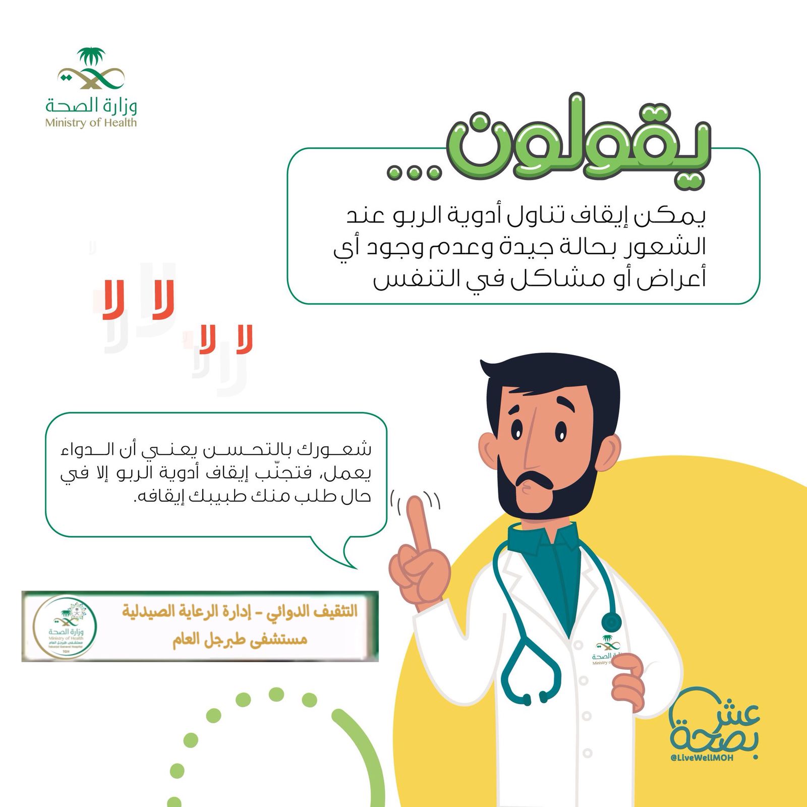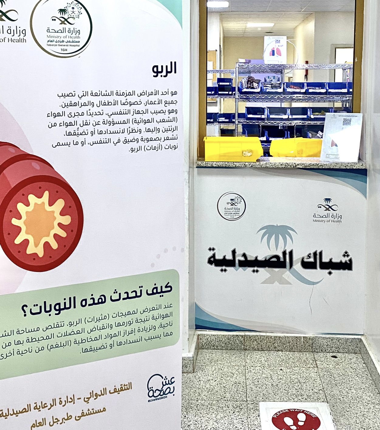 تضمن اللقاء توعية الحضور من مراجعين و منسوبي المستشفى، بشاشة العرض داخل المستشفى ونبذة تعريفية عن مرض الربو و أنواعه و أسبابه و طرق الوقاية و العلاج منه.