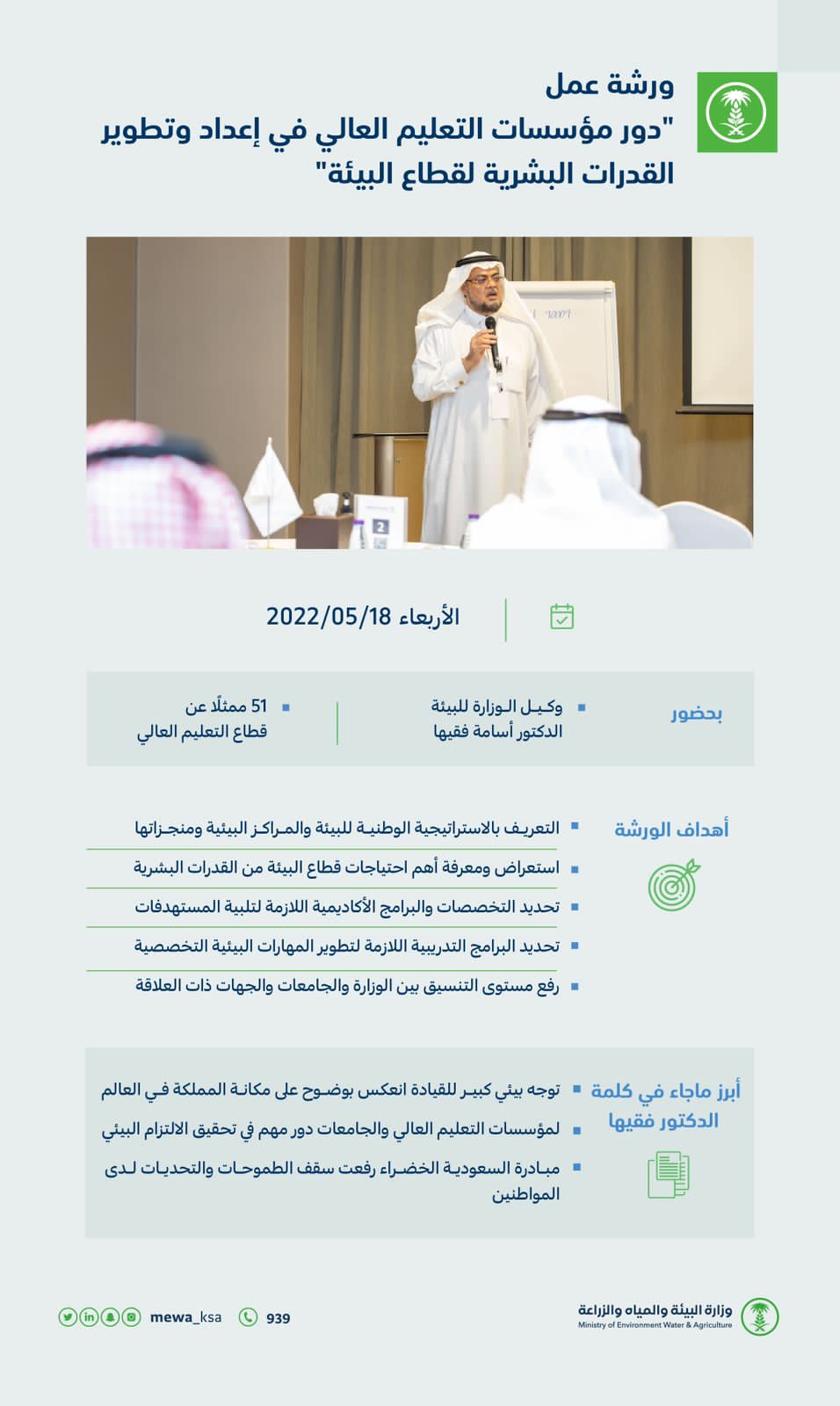 عقدت وزارة البيئة والزراعة اليوم ورشة عمل تحت عنوان” دور مؤسسات التعليم العالي في إعداد وتطوير القدرات البشرية لقطاع البيئة”، وذلك بحضور 51 ممثلًا عن قطاع التعليم العالي بالمملكة.