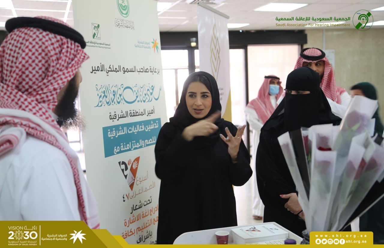 تحت رعاية صاحب السمو الملكي الأمير سعود بن نايف آل سعود امير المنطقة الشرقية حفظه الله وبأشراف فرع وزارة الموارد البشرية والتنمية الاجتماعية وبحضور المدير العام استاذ عبد الرحمن المقبل ومساعدته أ.ابتسام الحميزي اقامت الجمعية السعودية للإعاقة السمعية بالمنطقة الشرقية فعالية صم الشرقية والمتزامنة مع اسبوع الاصم العربي السابع والاربعون بعنوان (ادراج لغة الاشارة ضمن مناهج التعليم بكافة مراحلة) .