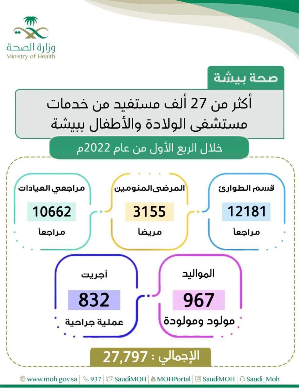 قدّم مستشفى الولادة والأطفال ببيشة خدماته لـ 27,797 مستفيداً وذلك خلال الربع الأول من عام 2022م.