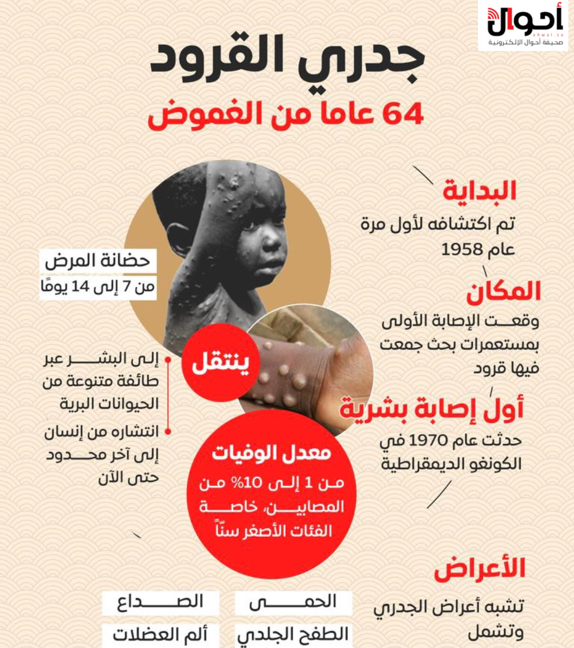 عقدت الصحة العالمية اجتماعا طارئاً لبحث تفشي جدري القردة الذي يعتبر مرض فيروسي نادر وحيواني المنشأ يُنقل فيروسه من الحيوان إلى الإنسان وتتماثل أعراض إصابته للإنسان تلكً التي كان يشهدها في الماضي المرضى المصابون بالجدري، ولكنه أقل شدّة. ومع أنالجدري كان قد استُؤصِل في عام 1980 ، فإن جدري القردة لا يزال يظهر بشكل متفرق في بعض أجزاء أفريقيا وينتمي فيروس جدري القردة إلى جنس الفيروسة الجدرية التابعة لفصيلة فيروسات الجدري. جاء اسمه شبيه من مرض بالجدري تفشى في مستعمرات من القردة المحفوظه للبحث وقد كُشِف لأوّل مرّة عن هذا الفيروس في عام 1985 بالمعهد الحكومي للأمصال الكائن في كوبنهاغن، الدانمارك ، أثناء التحري عن أحدالأمراض الشبيهة بالجدري فيما بين القردة ، ينتقل هذا المرض عن طريق الجهاز بالاتصال المباشر بجسد شخص مصاب وعبر الجهاز التنفسي و مخالطة مباشرة لدماء الحيواناتالمصابة بعدواه أو لسوائل أجسامها أو آفاتها الجلدية أو سوائلها المخاطية، وقد وُثِّقت في أفريقيا حالات عدوى نجمت عن مناولة القردة أوالجرذان الغامبية الضخمة أو السناجب المصابة بعدوى المرض، علماً بأن القوارض هي المستودع الرئيسي للفيروس. ومن المُحتمل أن يكون تناول اللحوم غير المطهية جيداً من الحيوانات المصابة بعدوى المرض عامل خطر يرتبط بالإصابة به ، وتتراوح فترة حضانة جدري القردة (وهي الفترة الفاصلة بين مرحلة الإصابة بعدواه ومرحلة ظهور أعراضها) بين 6 أيام و16 يوماً ، من اعراض هذا المرض الإصابة بحمى وصداع مبرح وتضخّم العقد اللمفاوية والشعور بآلام في الظهر وفي العضلات ووهن شديد في فقدان الطاقة ، وهناك تأتي فترة ظهور الطفح الجلدي في غضون مدة تتراوح بين يوم واحد و3 أيام عقب الإصابة بالحمى والتي تتبلور فيها مختلف مراحل ظهور الطفح الذي يبدأ على الوجه في أغلب الأحيان ومن ثم ينتشر إلى أجزاء أخرى من الجسم. ويكون وقع الطفح أشدّ ما يكون على الوجه في 95% من الحالات وعلى راحتي اليدين وأخمصي القدمين (75%). ويتطوّر الطفح في حوالي 10 أيام من حطاطات بقعية (آفات ذات قواعد مسطّحة) إلى حويصلات (نفاطات صغيرة مملوءة بسائل) وبثرات تليها جلبات قد يلزمها ثلاثة أسابيع لكي تختفي تماما ، تشتمل التشخيصات لهذا المرض التمايزية التي يجب أن يُنظر في إجرائها على أمراض أخرى مسببة للطفح، من قبيل الجدري والجدري المائي والحصبة والتهابات الجلد البكتيرية والجرب والزهري وأنواع الحساسيات الناجمة عن الأدوية. ويمكن أن يكون تضخّم العقد اللمفاوية خلال مرحلة ظهور بوادر المرض سمة سريرية تميزه عن الجدري ، ولا يمكن تشخيص جدري القردة بشكل نهائي إلاّ في المختبر حيث يمكن تشخيص عدوى الفيروس بواسطة عدد من الاختبارات المختلفة التالية المقايسة المناعية الأنزيمية واختبار الكشف عن المستضدات ومقايسة تفاعل البوليميراز المتسلسل وعزل الفيروس بواسطة زرع الخلايا ، بالنسبة لعلاج هذا المرض واللقاح منه لا توجد أيّة أدوية أو لقاحات مُحدّدة متاحة لمكافحة عدوى جدري القردة، ولكن يمكن مكافحة فاشياته. وقد ثبت في الماضي أن التطعيم ضدالجدري ناجح بنسبة 85% في الوقاية من جدري القردة، غير أن هذا اللقاح لم يعد متاحاً لعامة الجمهور بعد أن أُوقِف التطعيم به فيأعقاب استئصال الجدري من العالم. ورغم ذلك فإن من المُرجّح أن يفضي التطعيم المسبق ضد الجدري إلى أن يتخذ المرض مساراً أخف وطأة ، ومن الممكن الوقاية من هذا المرض هي الوقاية من اتساع نطاق انتشار جدري القردة عن طريق فرض قيود على تجارة الحيوانات قد يسهم تقييد عمليات نقل الثديات الأفريقية الصغيرة والقردة أو فرض حظر على نقلها إسهاماً فعالاً في إبطاء وتيرة اتساع نطاق انتشار الفيروس إلى خارج أفريقيا ، وينبغي ألا تُطعّم الحيوانات المحبوسة ضدّ الجدري، بل ينبغي عوضاً عن ذلك عزل تلك التي يُحتمل أن تكون مصابة منها بعدوى المرض عنالحيوانات الأخرى ووضعها قيد الحجر الصحي فوراً. وينبغي أيضاً وضع جميع الحيوانات التي قد تخالط أخرى مصابة بعدو