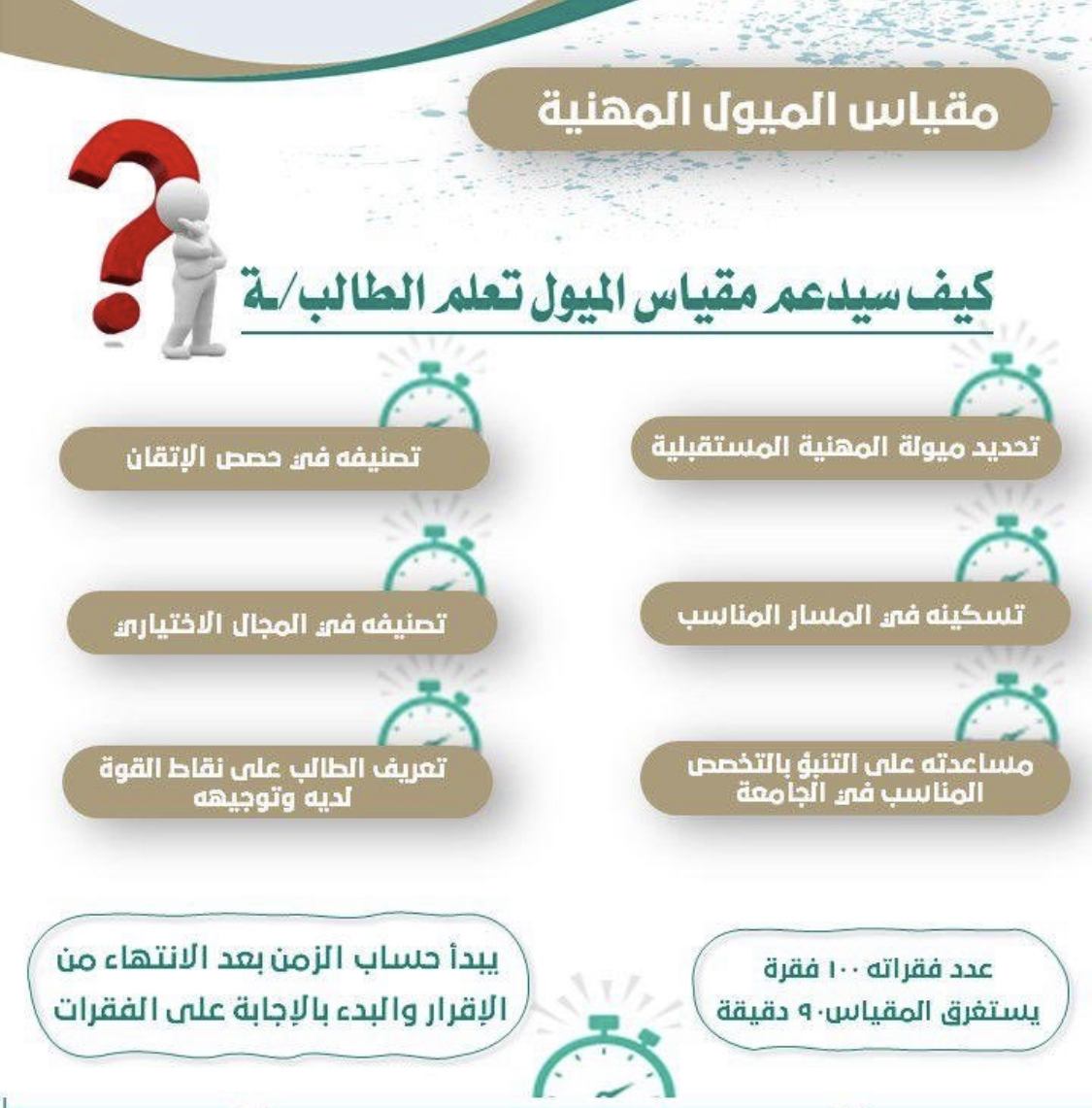 جاء ذلك لشرح مقياس الميول المهنية وحثهم على الاستعداد لتأدية الاختبار على منصة مدرستي ابتداء من هذا اليوم الأحد لمدة يومين حتى غداً الاثنين ٢٢ شوال ١٤٤٣ هـ ، والذي يهدف هذا الاختبار الى اكتشاف ميول أبنائنا الطلاب والطالبات وتوجيهاً واستثمار قدراتهم وتزويدهم بمهارات الحياة وتأهيلهم لسوق العمل لبناء مستقبل واعد للوطن .