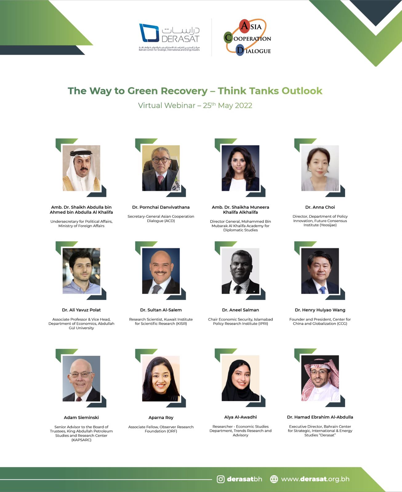 ينظم مركز البحرين للدراسات الاستراتيجية والدولية والطاقة “دراسات” ندوةً بعنوان “الطريق إلى التعافي الأخضر.. توقعات المراكز الفكرية” اليوم الأربعاء 25 مايو 2022م، عبر تقنية الاتصال المرئي، ذلك في إطار ترؤس مملكة البحرين للدورة الحالية 2021 – 2022م من حوار التعاون الآسيوي في عامه العشرين.