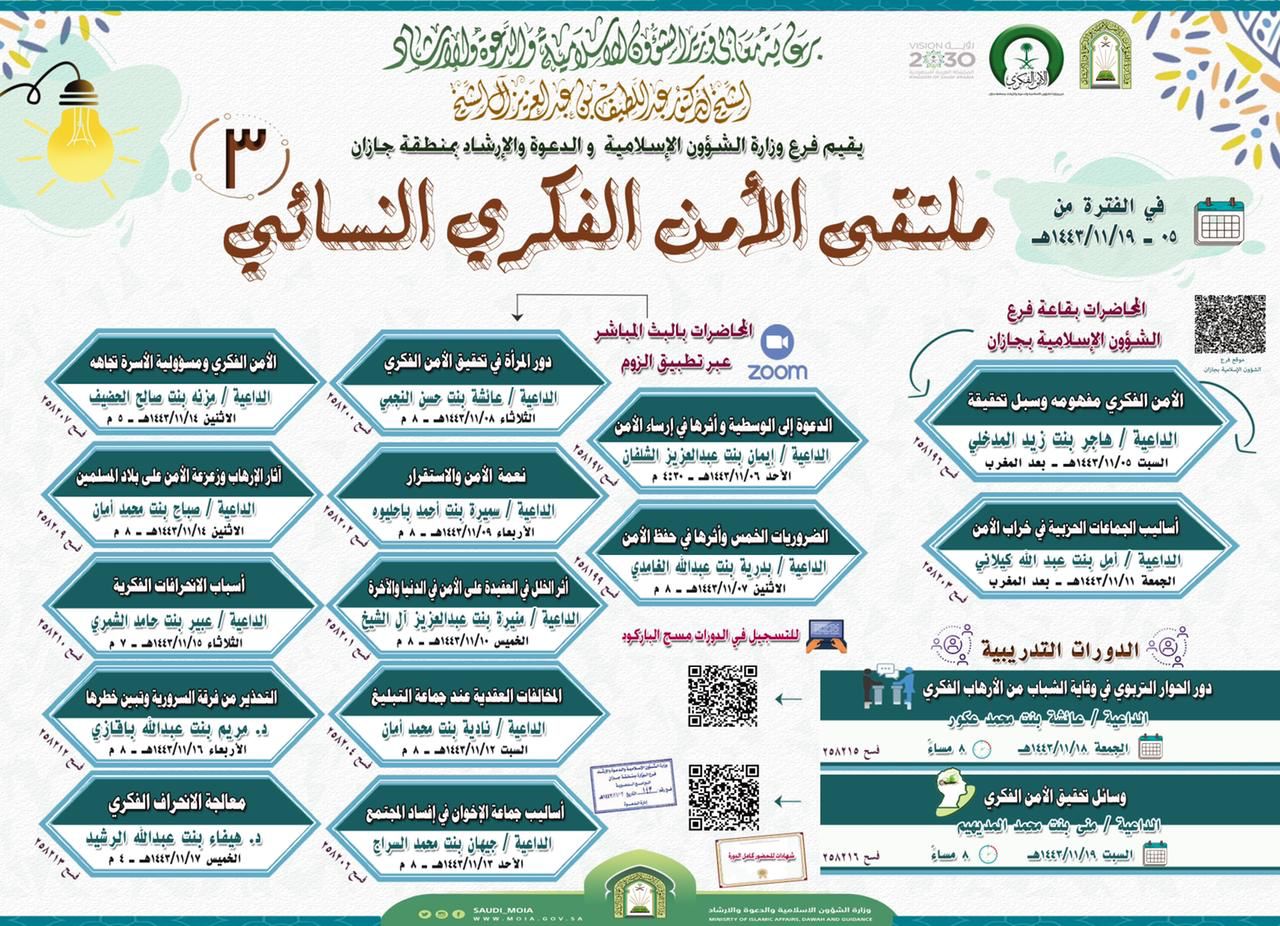 يطلق فرع وزارة الشؤون الإسلامية والدعوة والإرشاد في منطقة جازان مساء السبت الخامس من شهر ذي القعدة ١٤٤٣ هجرية ملتقى الأمن الفكري النسائي الثالث.