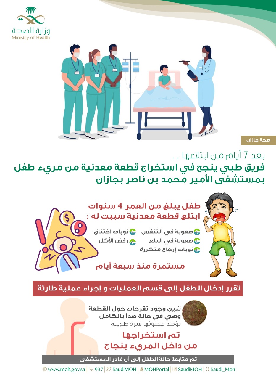 قالت صحة جازان بأن أطباء الأنف والأذن والحنجرة بمستشفى الأمير محمد بن ناصر نجحوا في استخراج قطعة معدنية من مريء طفل بعد سبعة أيام من ابتلاعها ، وذلك بعد إجراء عملية جراحية تكللت بالنجاح ولله الحمد .