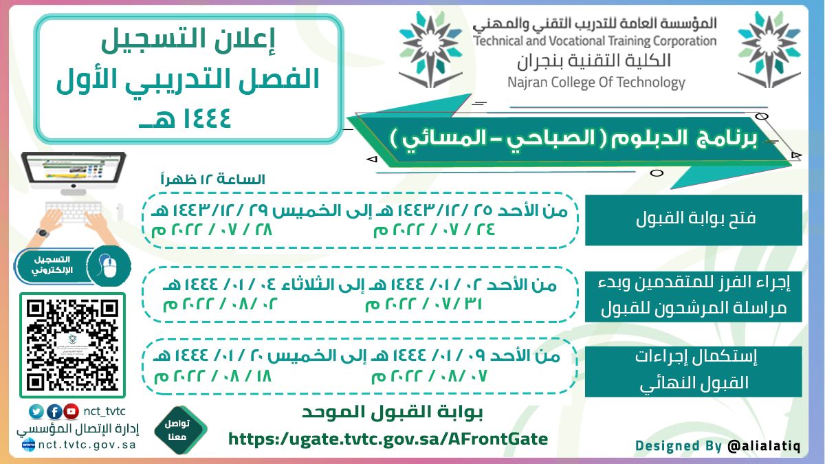 أعلنت الكلية التقنية بنجران عن موعد بدء التسجيل في برنامجي الدبلوم الصباحي والمسائي للفصل التدريبي الأول من العام التدريبي 1444هـ، حيث سيتم فتح بوابة القبول للدبلوم الصباحي والمسائي لمدة خمسة أيام، بدءاً من يوم الأحد الموافق 25 /12 / 1443 هـ ، وينتهي يوم الخميس 29 / 12 / 1443 هـ، وذلك عبر بوابة القبول الموحد https://ugate.tvtc.gov.sa/AFrontGate/