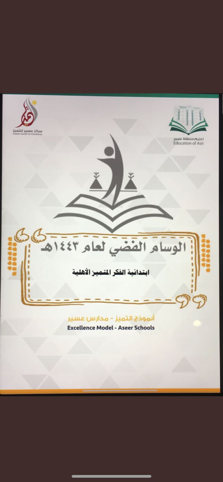 حصلت إبتــدائية الفكر المــتـمـيز بأبها يوم أمس بتاريـخ 22/11/1443 على الوسام الفضي من قِبل تعليم منطقة عسير في (أنموذج التميز )
