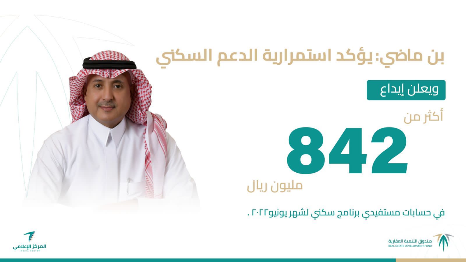 أعلن صندوق التنمية العقارية اليوم عن إيداعه أكثر من 842 مليون ريال في حسابات المواطنين من مستفيدي برنامج “سكني” من وزارة الشؤون البلدية والقروية والإسكان و”الصندوق العقاري” لشهر يونيو 2022 وذلك تأكيدًا لإستمرارية الدعم السكني للأسر لتملّك المسكن الأول.وأوضح الرئيس التنفيذي لصندوق التنمية العقارية منصور بن ماضي أن إجمالي الدعم لشهر يونيو بلغ 842 مليون ريال، خُصصت دعماً لأرباح عقود التمويل العقاري المدعوم، موضحاً أن إجمالي ما تمّ إيداعه في حسابات مستفيدي سكني منذ إعلان برنامج التحّول في يونيو 2017 حتى شهر يونيو 2022 تجاوز 38.4 مليار ريال.