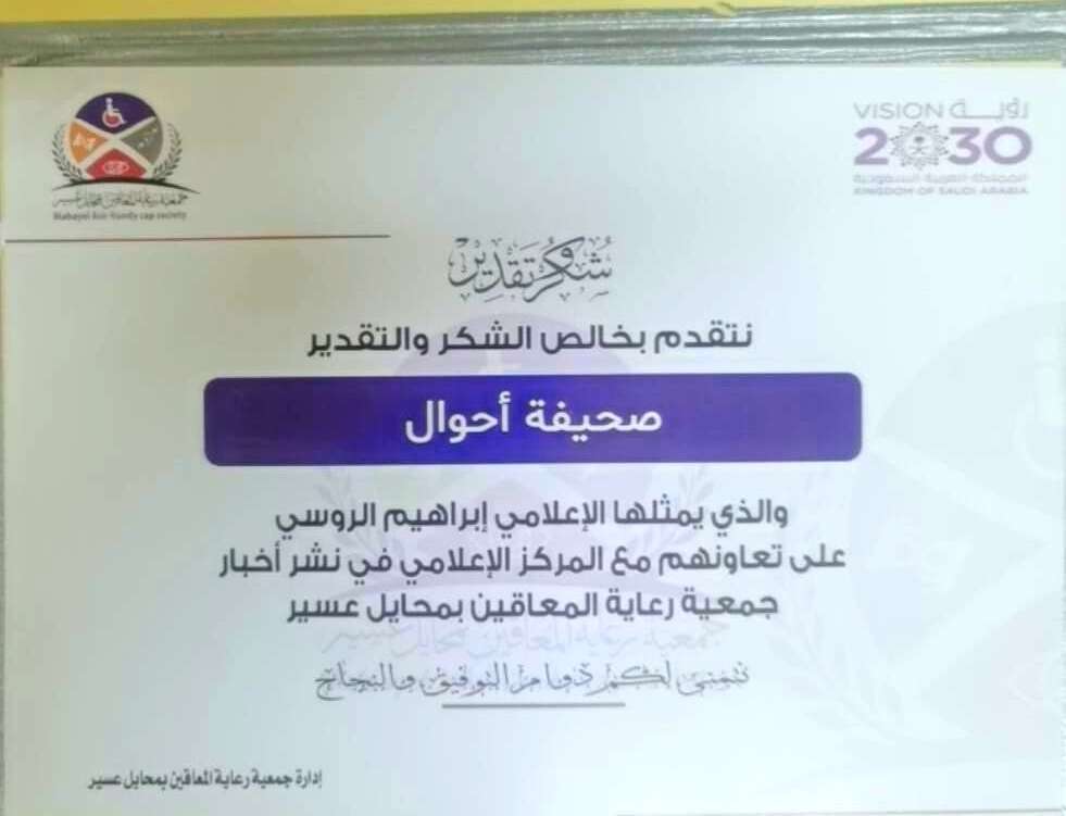 كرّمت إدارة جمعية رعاية المعاقين بمحايل عسير عدداً من الإعلاميين والإعلاميات بالمحافظة نظير جهودهم وتعاونهم في تغطية ونشر أخبار وبرامج الجمعية وذلك مساء أمس الثلاثاء 1443/12/6ه في مقهى فورسيزون بمحايل .