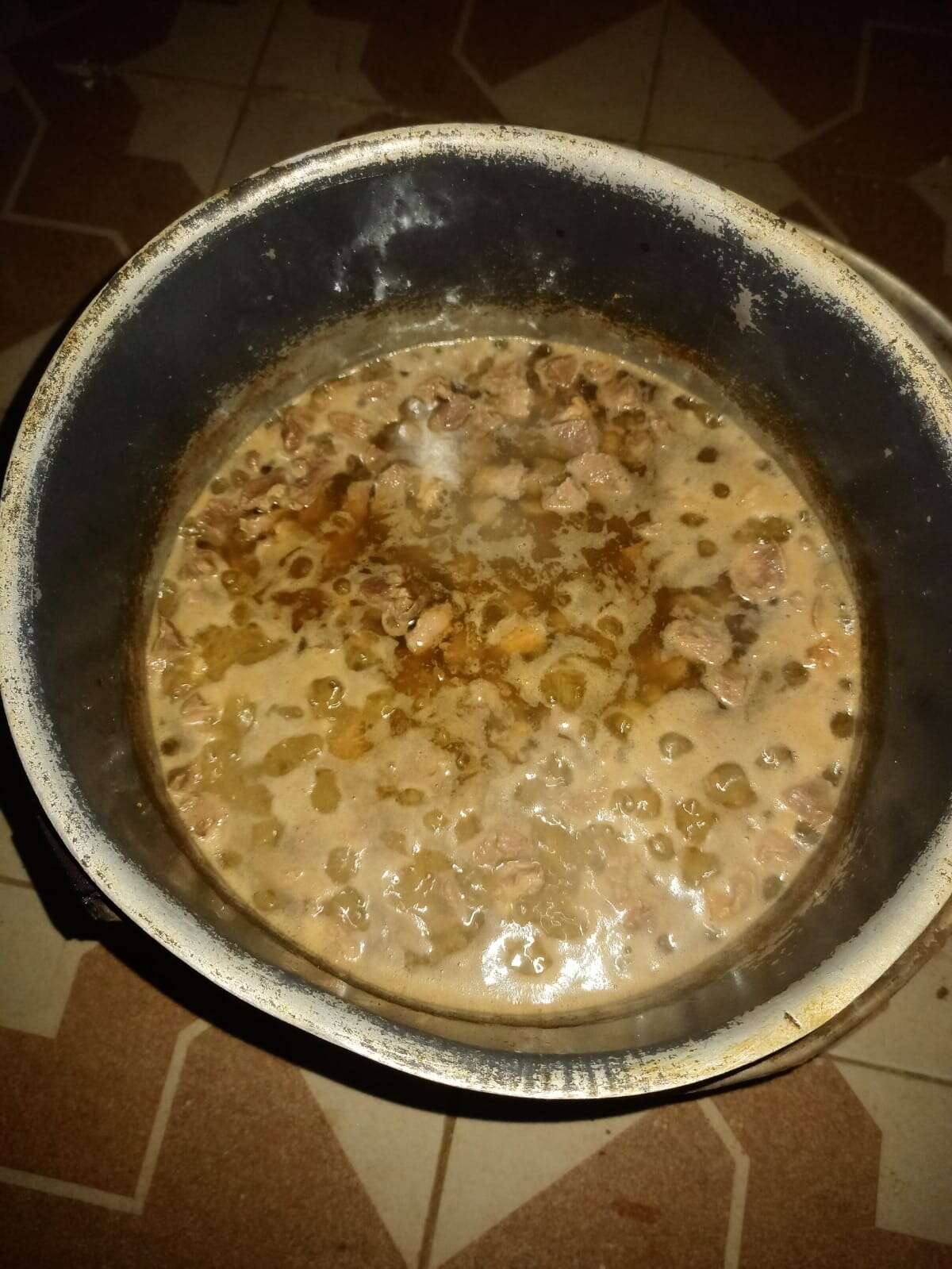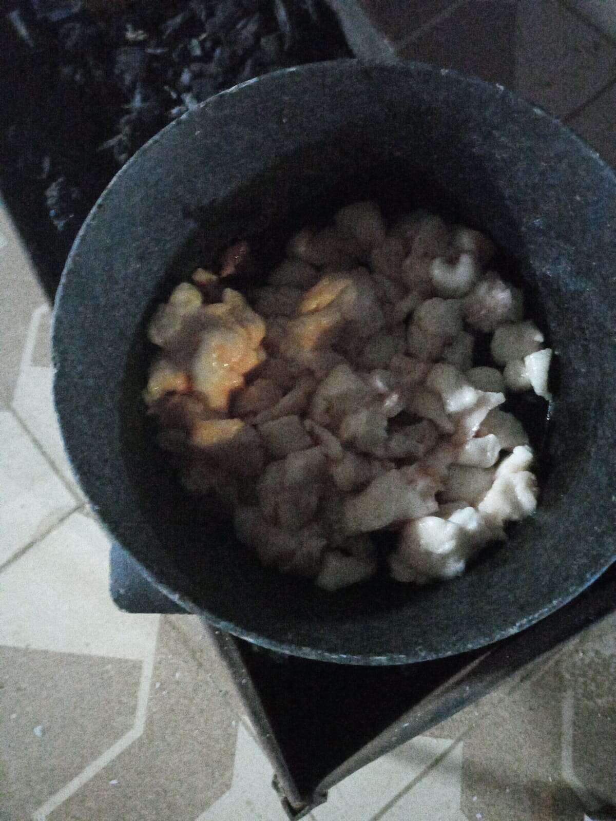 طبخ الشحم حتى المذاب ثم وضع من قطع من اللحم الصغيرة في زيت الشحم المذاب، ومضاف عليه البهارات.