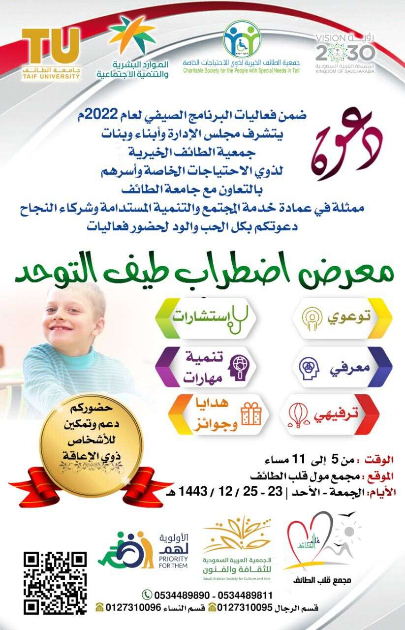 عواض الحارثي – الطائف : تنظم جمعية الطائف الخيرية لذوي الاحتياجات الخاصة بالتعاون مع عمادة خدمة المجتمع والتنمية المستدامة بجامعة الطائف وعدد من شركاء النجاح معرض اضطراب طيف التوحد وذلك بمجمع مول الطائف .