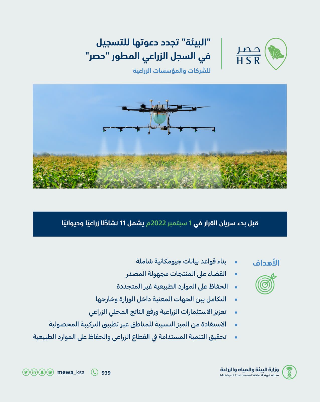 وكان معالي وزير البيئة والمياه والزراعة المهندس عبد الرحمن بن عبد المحسن الفضلي قد دشن مؤخرًا مشروع السجل الزراعي المطور “حصر”، الذي يستهدف القطاع الزراعي في المملكة بجميع أنشطته الزراعية والحيوانية، وجميع الحيازات الزراعية من خلال قواعد بيانات جيومكانية ويشمل المشروع 11 نشاطًا مختلفًا، وقد وفرت الوزارة أكثر من 655 موظفًا موزعين في 13 منطقة و151 محافظة ووحدة ومكتب تابع للوزارة يعملون على إصدار سجلات زراعية.