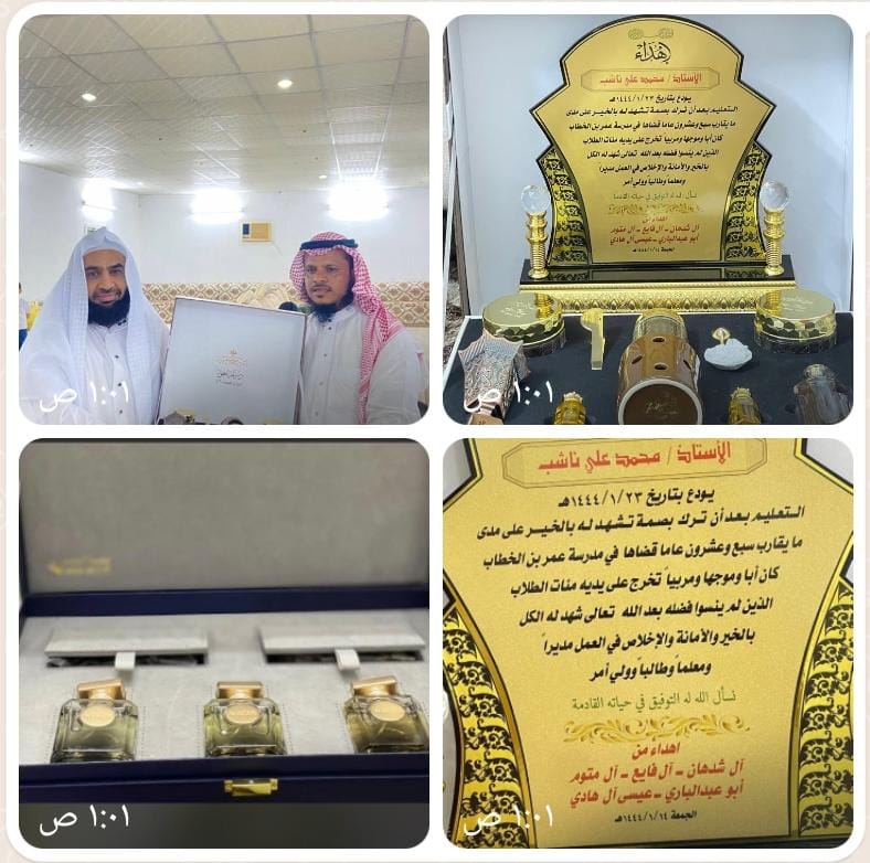 في ليلةٍ من ليالي الفرح والسرور ممزوجةٍ بمعاني الحب والتقدير والوفاء أُقيم تكريم خاص للمعلم القدير والشيخ الفاضل “محمد بن علي ناشب” الذي ترجل عن صهوة جواده بعد مسيرةٍ حافلة بالعطاء في مسيرة التعليم والتي زادت على أكثر من 27 عاماً قضاها في مدرسة عمر بن الخطاب بالمومية.
