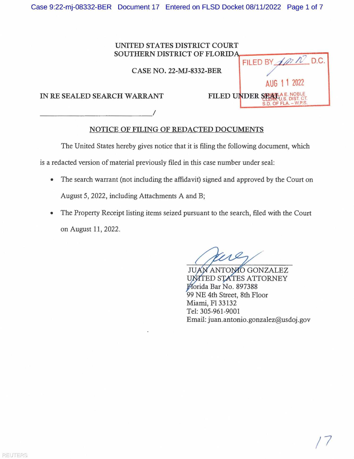 ولم تقدم أوراق المحكمة تفاصيل محددة حول الوثائق ولا المعلومات التي قد تحتوي عليها، غير أن مصادر صحفية قالت إن موظفي إف.بي.آي الذين فتشوا المنزل أخذوا نحو 20 صندوقا من الوثائق ومجلدات من الصور ومذكرة مكتوبة بخط اليد، والأمرالتنفيذي باستخدام الرأفة مع روجر ستون حليف ترامب.