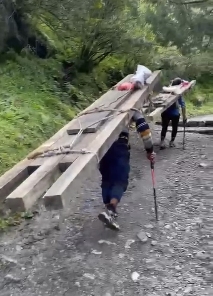 ٥ الحمالين في الجبال ينقلون الحديد على ظهورهم وكأنهم قلابات دايهاتسو سطح من الخشب يحمل عليه الحديد طوله ثلاثة أمتار وفيه صور توضح لكم المشهد.