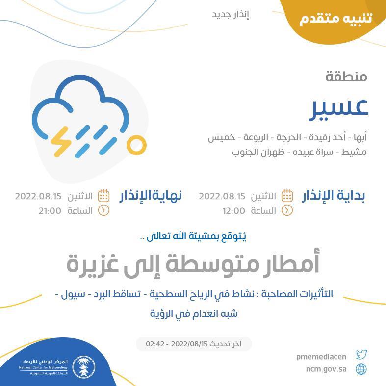 أصدر المركز الوطني للأرصاد اليوم، تنبيهاً متقدماً عن تكوّن أمطارٍ من متوسطة إلى غزيرة على منطقة عسير،ويتوقع أن تشمل تأثيراتها المصاحبة نشاطاً في الرياح السطحية وتساقط البرد وجريان السيول وشبه إنعدام الرؤية، وذلك على مدينة أبها ومحافظات أحد رفيدة والحرجة والربوعة وخميس مشيط وسراة عبيدة وظهران الجنوب.