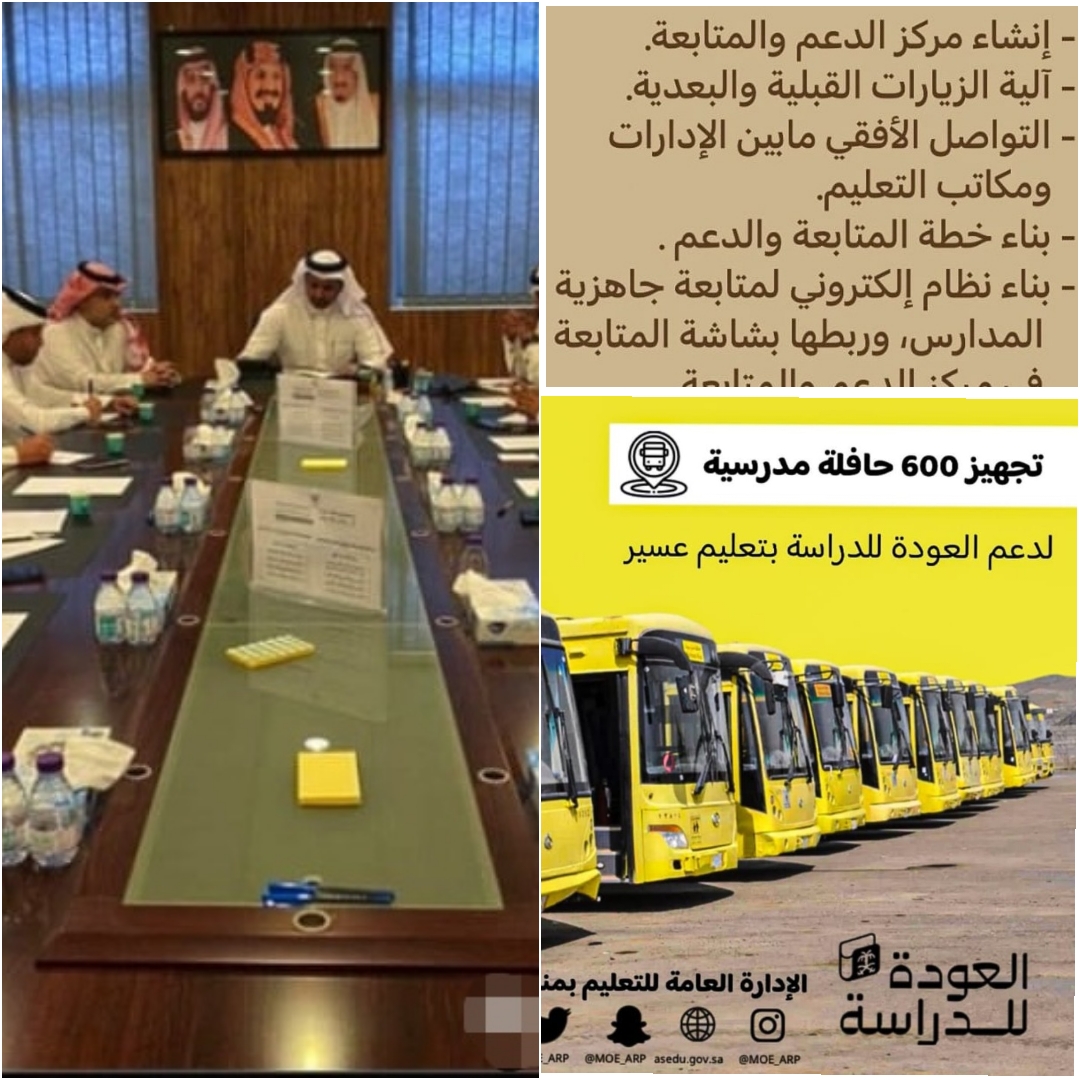 من ناحية أخرى جهّزت إدارة خدمات الطلاب بتعليم عسير ، بالتعاون مع شركة تطوير لخدمات النقل المدرسي 600 حافلة لدعم العودة للدراسة، ودعت الإدارة أولياء الأمور إلى المبادرة لتسجيل أبنائهم وبناتهم وحجز مقاعدهم عبر نظام نور، متمنين للجميع عاماً دراسياً حافلاً بالعطاء والإنجازات.