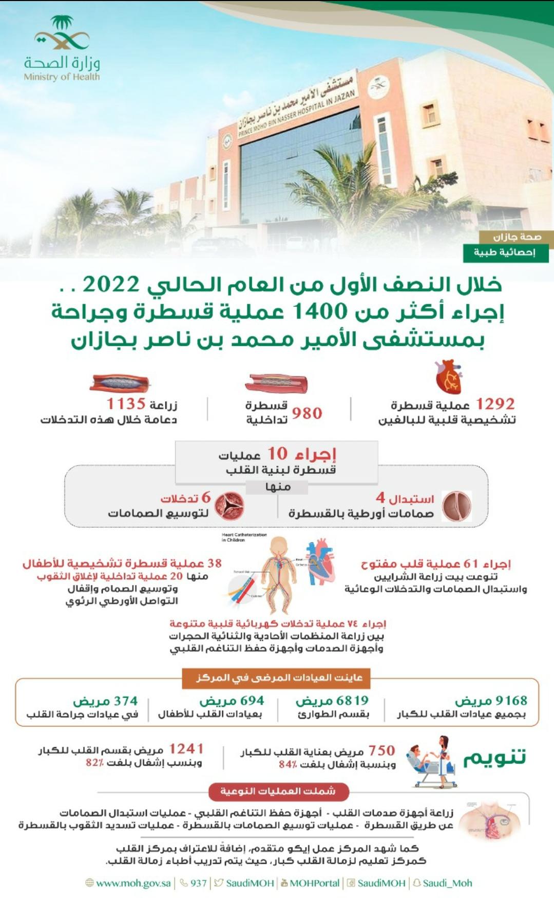 قالت صحة جازان أن مركز القلب بمستشفى الأمير محمد بن ناصر أجرى أكثر من 1400 عملية قسطرة وجراحة قلب خلال النصف الأول من العام الحالي 2022م.