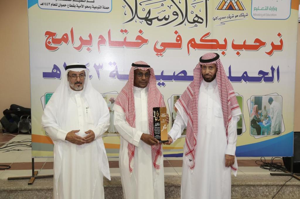 رعى محافظ محايل عسير الأستاذ علي بن إبراهيم الفلقي وبحضور مدير التعليم بالمحافظة منصور بن عبدالله آل شريم ورئيس مركز السلام فهد محمد عسيري وعدداً من القيادات التربوية اليوم ختام فعاليات الحملة الصيفية للتوعية ومحو الأمية في قطاع حموان التابع لإدارة تعليم محايل والتي تنفذها وزارة التعليم .
