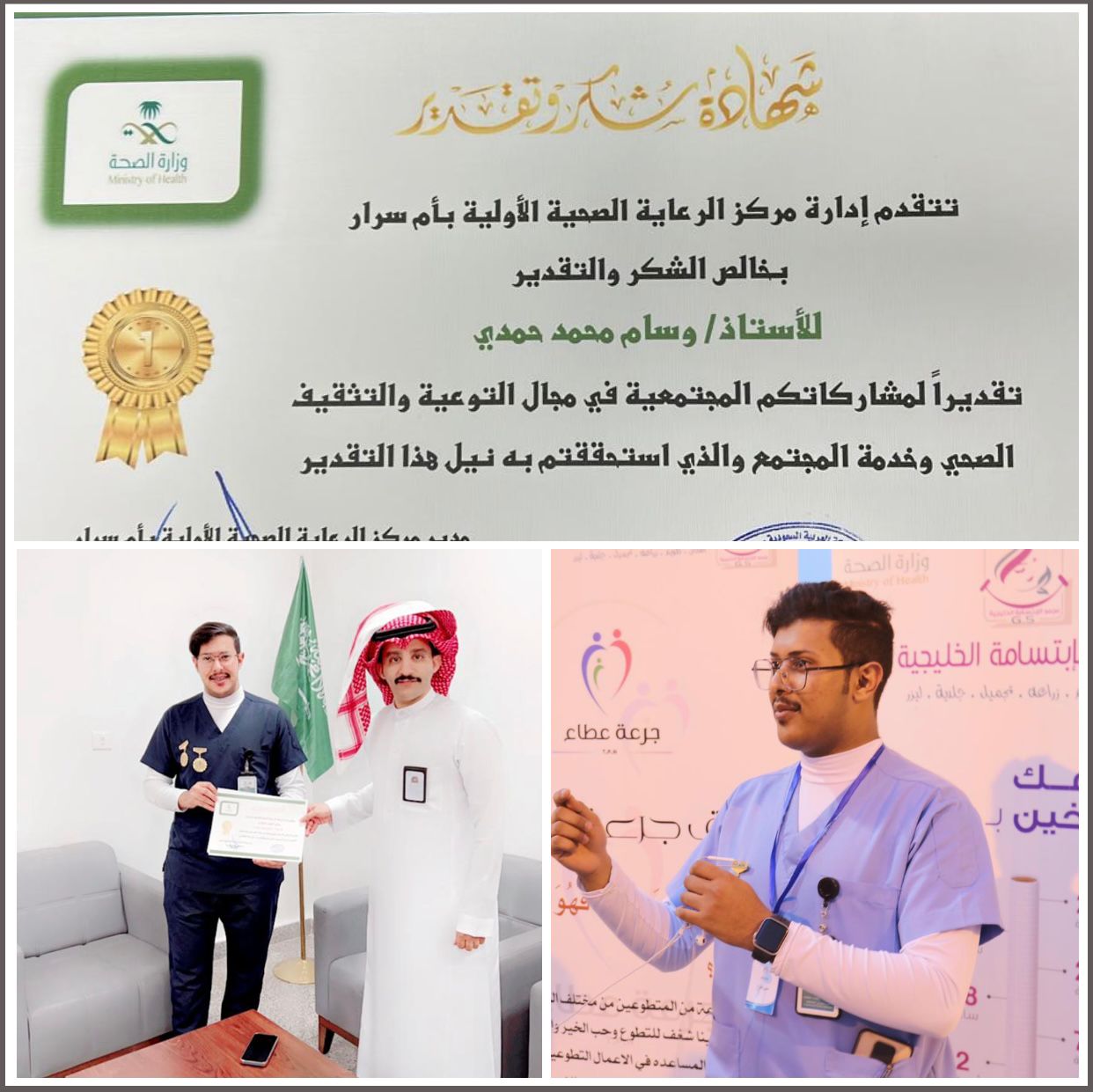 قدم مركز الرعاية الصحية بأم سرار خميس مشيط شكر وتقدير للأستاذ/ وسام محمد حمدي، نضيرآ لمشاركته المجتمعية الفعالة في مجال التوعية والتثقيف الصحي وخدمة المجتمع.
