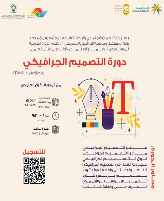 نفذ مكتب الضمان الاجتماعي ببلجرشي التابع لفرع وزارة الموارد البشرية والتنمية الاجتماعية بالمنطقة الباحة برنامجين تدريبين لمستفيديه من الجنسين وبالشراكة مع جمعية بنيان للخدمات الاجتماعية دورة بعنوان (حل المشكلات واتخاذ القرار ) و معهد رؤية المستقبل وجمعية البر الخيرية ببلجرشي دورة تدريبية بعنوان ( التصميم الجرافيكي ) عن طريق برنامج (الزوم).