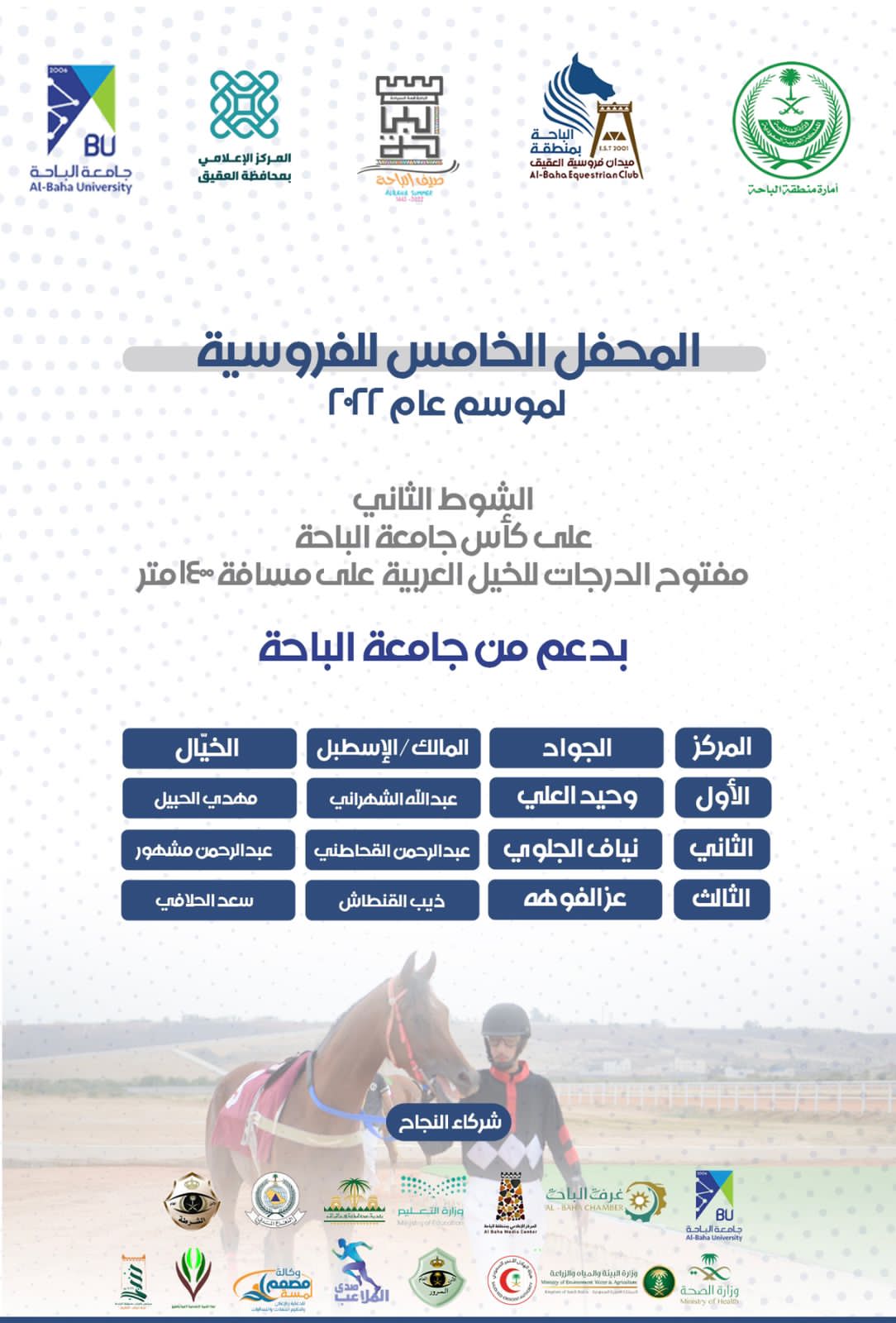 اقيم مساء اليوم على ميدان الفروسية بمحافظة العقيق التابع لمنطقة الباحة حفل السباق الخامس الذي تكون من ثلاثة أشواط وكانت نتائجة على النحو التالي :
