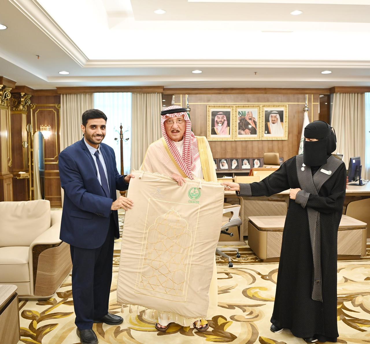 وفي ختام اللقاء تسلم سموه هدية تذكارية تم صنعها بأيدي طالبات الكلية التقنية بالمنطقة.