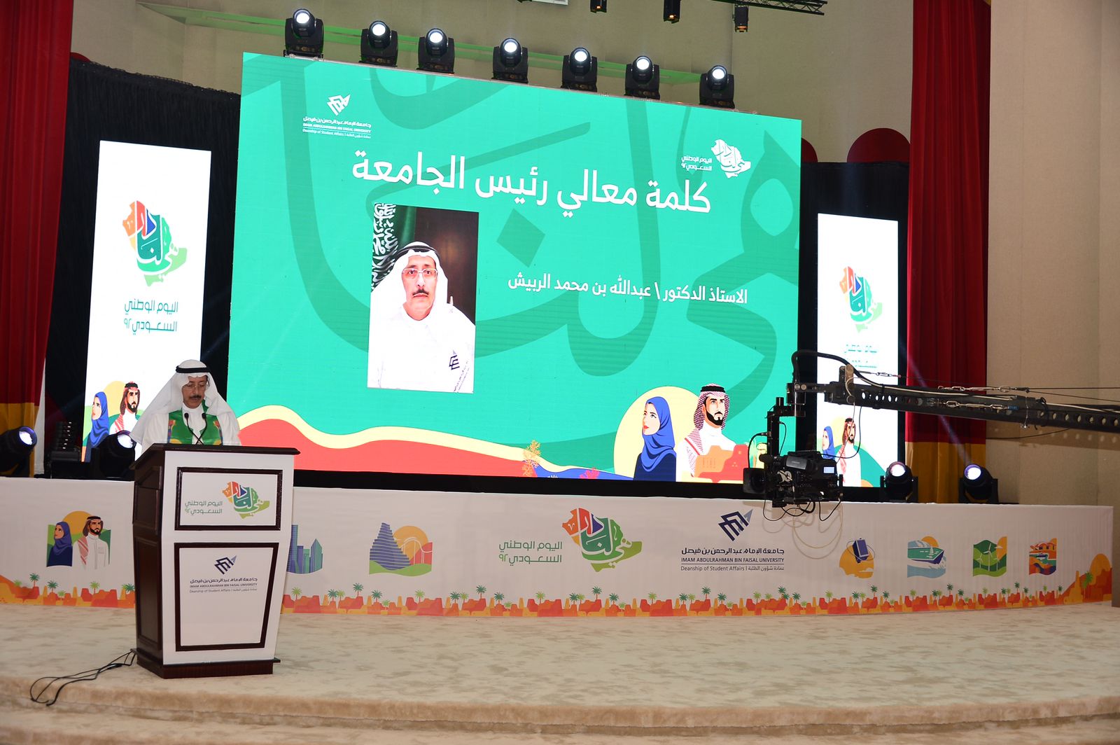 احتفلت جامعة الامام عبد الرحمن بن فيصل (أمس الأحد) ممثلة بعمادة شؤون الطلبة بمناسبة اليوم الوطني 92، وذلك في قاعة المؤتمرات برعاية وحضور رئيس الجامعة الأستاذ الدكتور عبد الله الربيش ووكلاء الجامعة وعميد شؤون الطلبة الدكتور علي الدوسري والعمداء والطلاب ومنسوبي الجامعة.