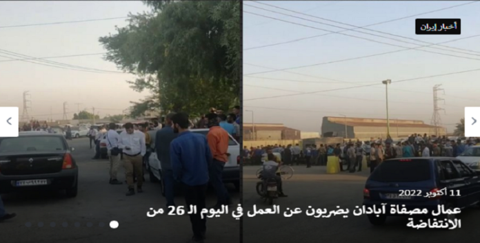 اليوم الثلاثاء 11 أكتوبر وفي اليوم الـ 26 من الانتفاضة الوطنية للشعب الإيراني بدأ العاملون في بتروكيمياويات مصفاة آبادان إضرابًا عن العمل في الساعات الأولى من صباح يوم الثلاثاء 11 أكتوبر وتجمعوا أمام بوابة 14. جاء هذا بحسب ما نشر عبر المجلس الوطني للمقاومة الايرانية.