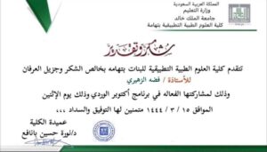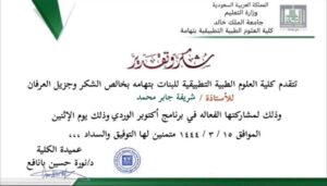 الشكر لعميدة الكلية الصحية التطبيقية للبنات بجامعة الملك خالد فرع تهامة (محايل) الدكتورة نورة حسين بانافع.