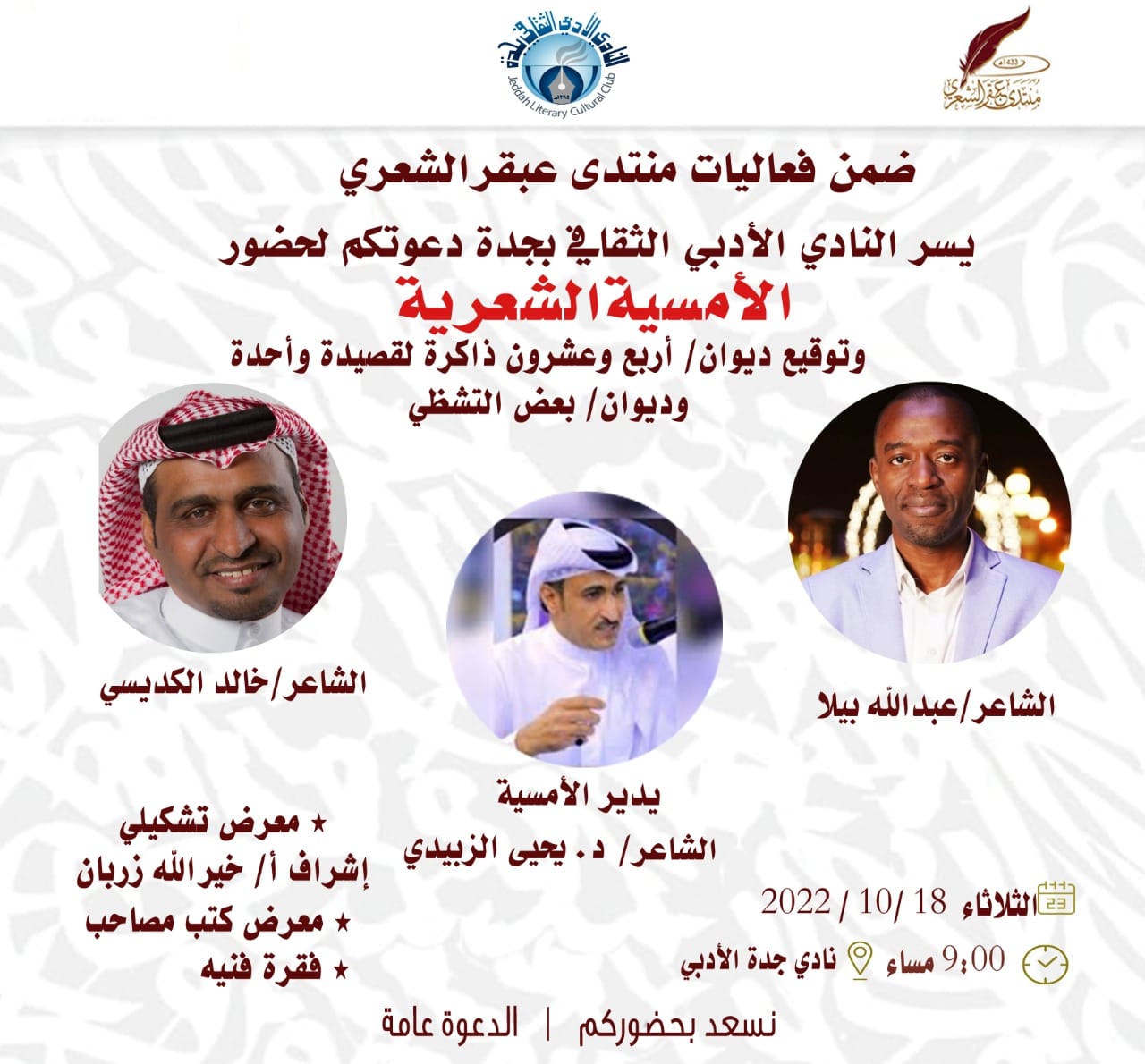ينظم منتدى عبقر الشعري ، بالنادي الأدبي الثقافي بجدة بعد غد الثلاثاء 18/ 10/ 2022 أمسية شعرية،لكل من الشاعر عبدالله بيلا والشاعر خالد الكديسي ويدير الأمسية الدكتور يحي الزبيدي عضو منتدى عبقر الشعري . كما يصاحب الأمسية توقيع ديوان اربع وعشرون ذاكرة لفصيدة واحدة ِ وديوان بعض التشظي.