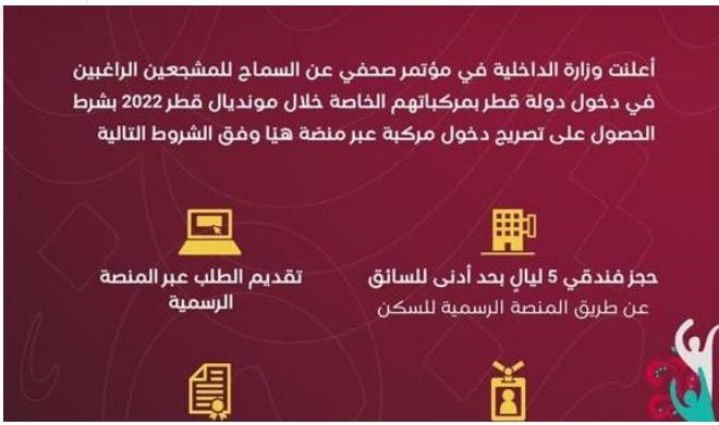 أوضحت وزارة الداخلية القطرية بانه يسمح للمشجعين الراغبين في دخول دولة قطر بمركباتهم الخاصة خلال مونديال قطر 2022 بشرط الحصول على تصريح دخول مركبة عبر منصة هيا وفق الشروط التالية