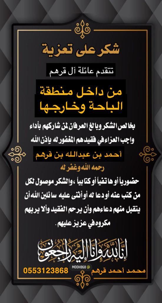 لكل من قدم لنا التعزية الصادقة والمواساة الحسنة في وفاة والدي الفقيد (المرحوم بإذن الله) أحمد بن عبدالله مسفر قرهم .