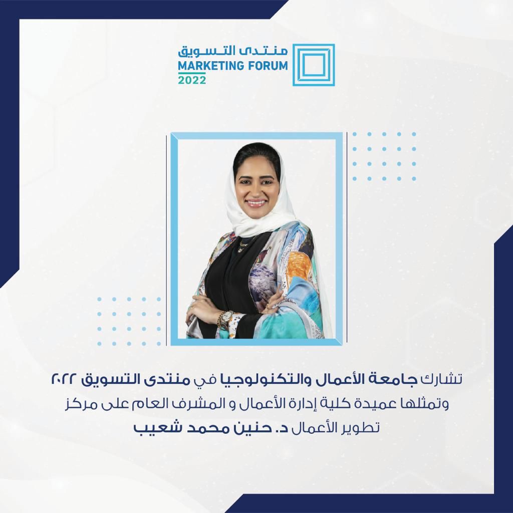 تشارك جامعة الأعمال والتكنولوجيا بجدة يوم غد الأحد الثالث والعشرين من شهر أكتوبر الحالي بمنتدى التسويق الخامس بالرياض، من خلال كلية ادارة الأعمال متمثلة بمشاركة الأستاذ المشارك الدكتورة حنين محمد شعيب، عميدة كلية ادارة الاعمال للطالبات والمشرف العام على مركز تطوير الأعمال بالجامعة، من خلال جلسة “تقييم التجربة التسويقية للجامعات في المملكة”.