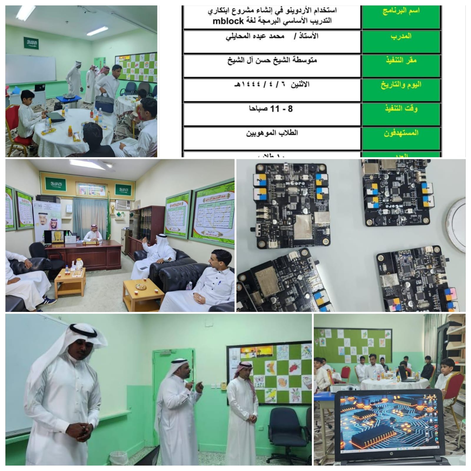 نيابة عن مدير مكتب التعليم بقنا أ٠ عبدالله غازي عسيري وبحضور رئيس الشؤون التعليمية أ-جابر الشاعري وبمتابعة من قسم رعاية الموهوبين بإدارة تعليم محايل عسير وتماشياً مع رؤية المملكة 2030 تم تنفيذ البرنامج التدريبي استخدام الاردوينو والذي ينفذه المدرب الأستاذ محمد بن عبده المحايلي ويستهدف هذا البرنامج الطلاب الموهوبين المسجلين في الأولمبياد الوطني 2023 في مدارس المرحلة المتوسطة والثانوية بمكتب تعليم قنا وقد نُفذ البرنامج في مدرسة الشيخ حسن ال الشيخ المتوسطة بقنا وقد عبر مدير مكتب التعليم عن شكره للمدرب القدير والطلاب الحاضرين ومدير المدرسة المستضيفة .
