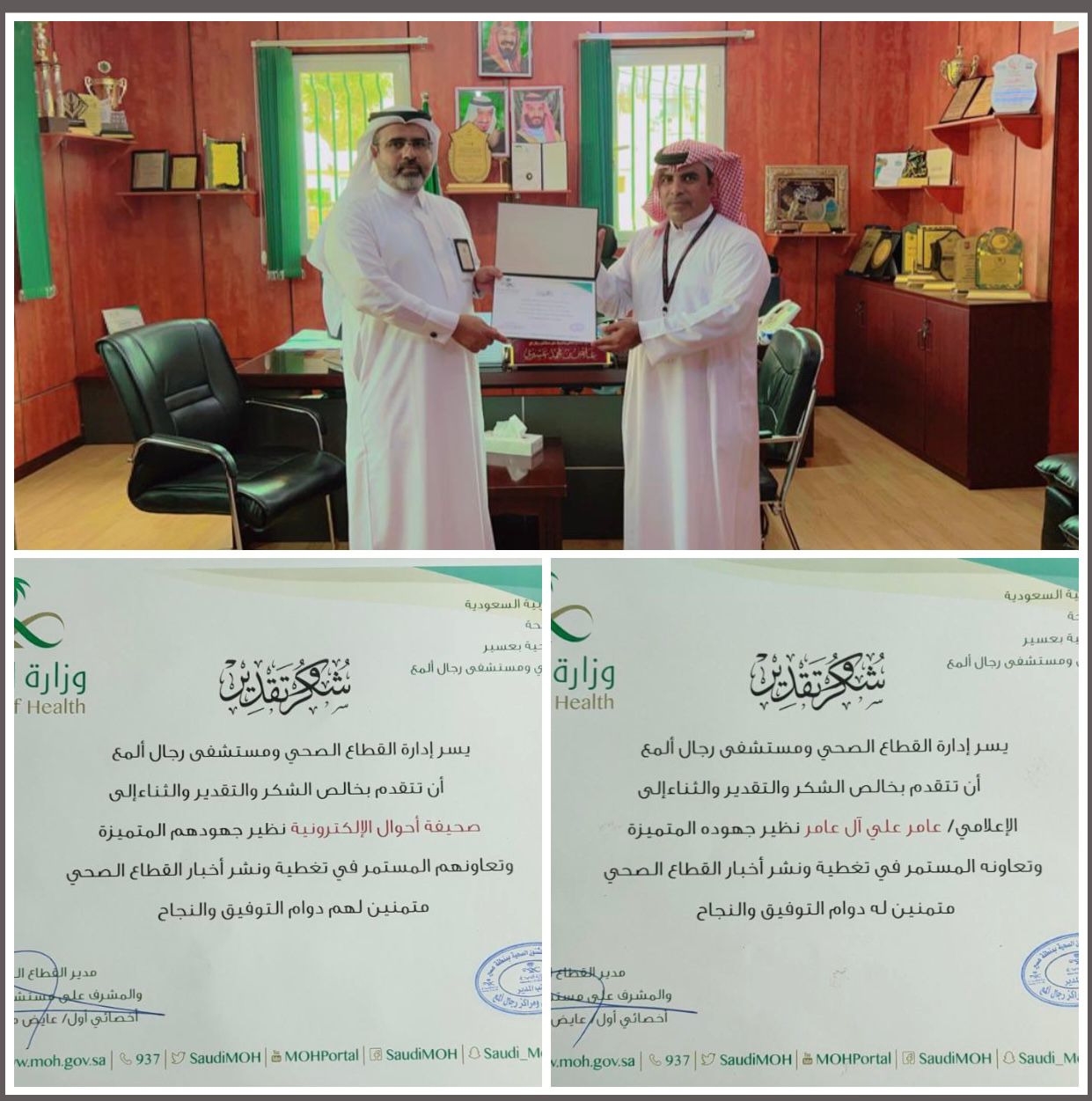 كرم مدير القطاع الصحي في محافظة رجال ألمع الأخصائي أول: عايض محمد عسيري اليوم الأحد صحيفة أحوال الإلكترونية والأستاذ الإعلامي عامر آل عامر مراسل الصحيفة في رجال ألمع وذلك نظير مايقوم به آل عامر والصحيفة من جهود متتالية في تغطيات فعاليات وأخبار القطاع الصحي في رجال ألمع.
