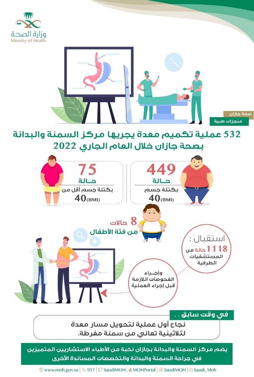 أجرى مركز السمنة والبدانة بمستشفى الأمير محمد بن ناصر بجازان 532 عملية جراحية لتكميم المعدة خلال الفترة من بداية شهر يناير وحتى نهاية شهر سبتمبر من العام الميلادي الجاري 2022 .