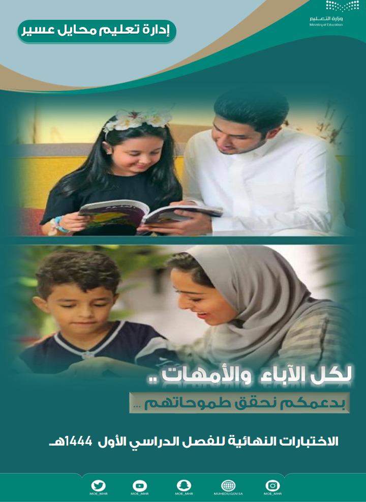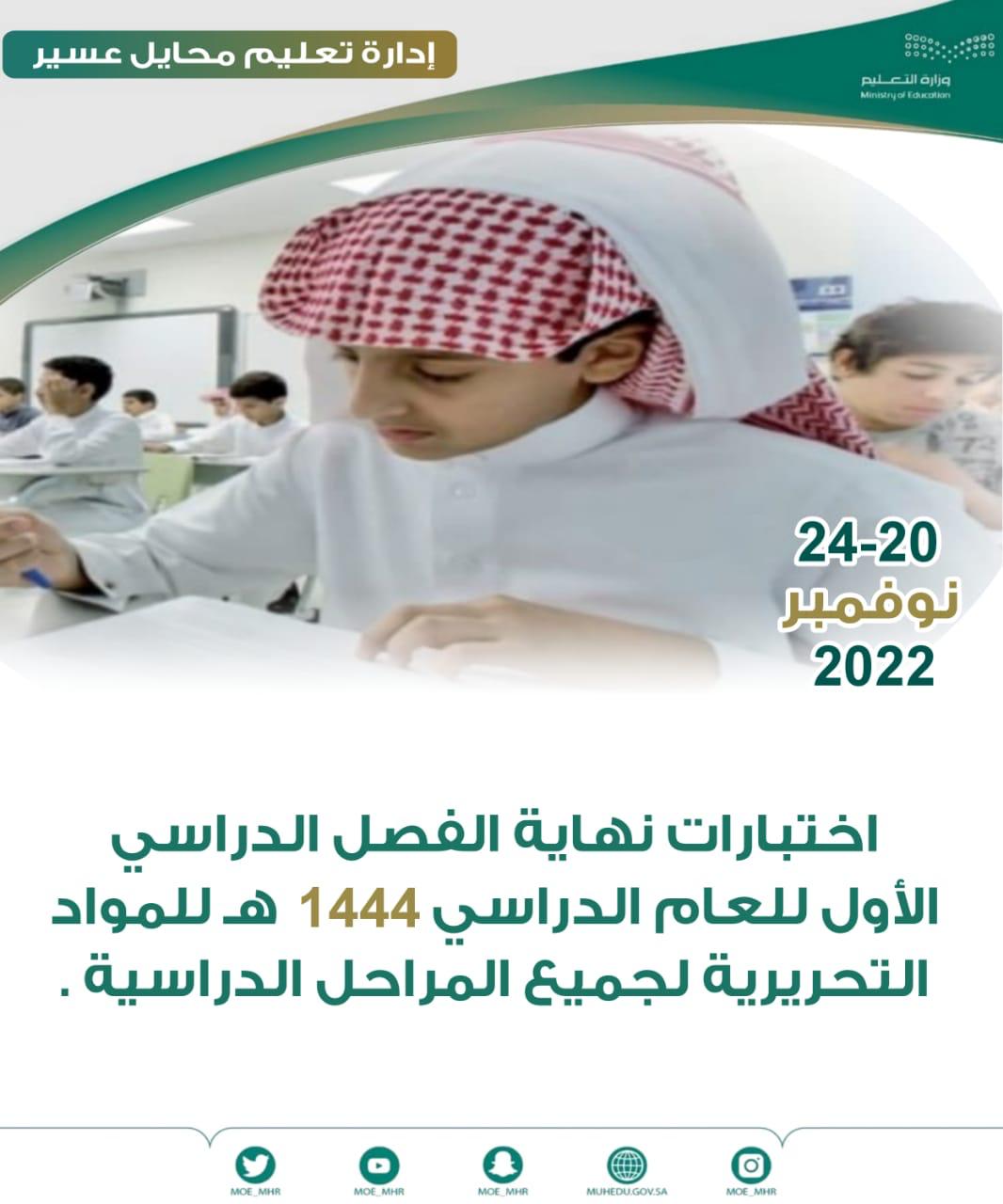يستعد ليوم غدٍ الأحد 26 ربيع الثاني 1444 (86) ألف طالب وطالبة لأداء اختباراتهم النهائية التحريرية للفصل الدراسي الأول في (765 ) مدرسة وسط إجراءات واستعدادات فنية وتنظيمية لإدارة ومكاتب ومدارس تعليم محايل عسير.