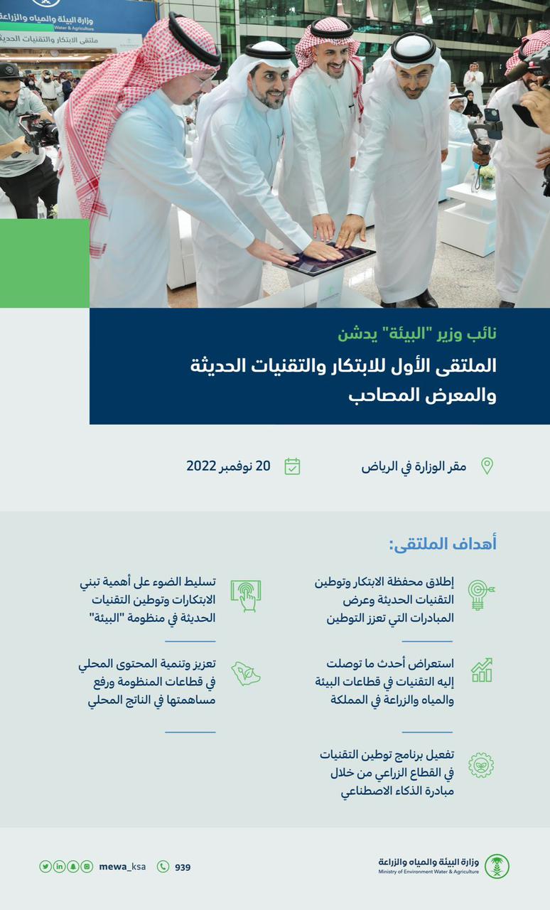 دشّن معالي نائب وزير البيئة والمياه والزراعة المهندس منصور بن هلال المشيطي، الملتقى الأول للابتكار والتقنيات الحديثة والمعرض المصاحب، بحضور معالي رئيس مدينة الملك عبدالعزيز للعلوم والتقنية الدكتور منير بن محمود الدسوقي، ومعالي نائب وزير الاتصالات المهندس هيثم العوهلي ومشاركة عدد من الجهات والشركات في قطاعات المنظومة، وذلك بمقر وزارة البيئة والمياه والزراعة في الرياض.