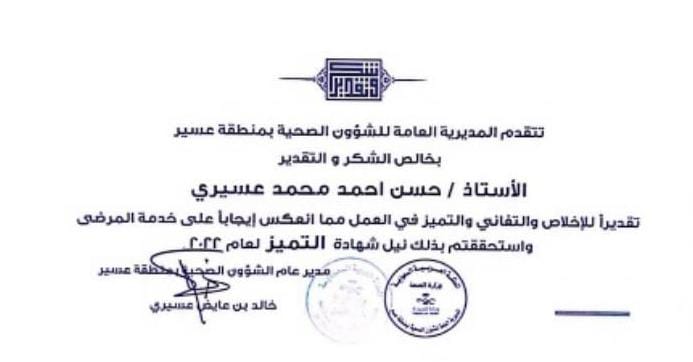 حصل الأستاذ حسن بن أحمد الغنمي أحد منسوبي القطاع الصحي في رجال ألمع : على شهادة التميز على مستوى الشؤون الصحية بمنطقة عسير وذلك نظير جهوده المتميزة في خدمة المستفيدين.