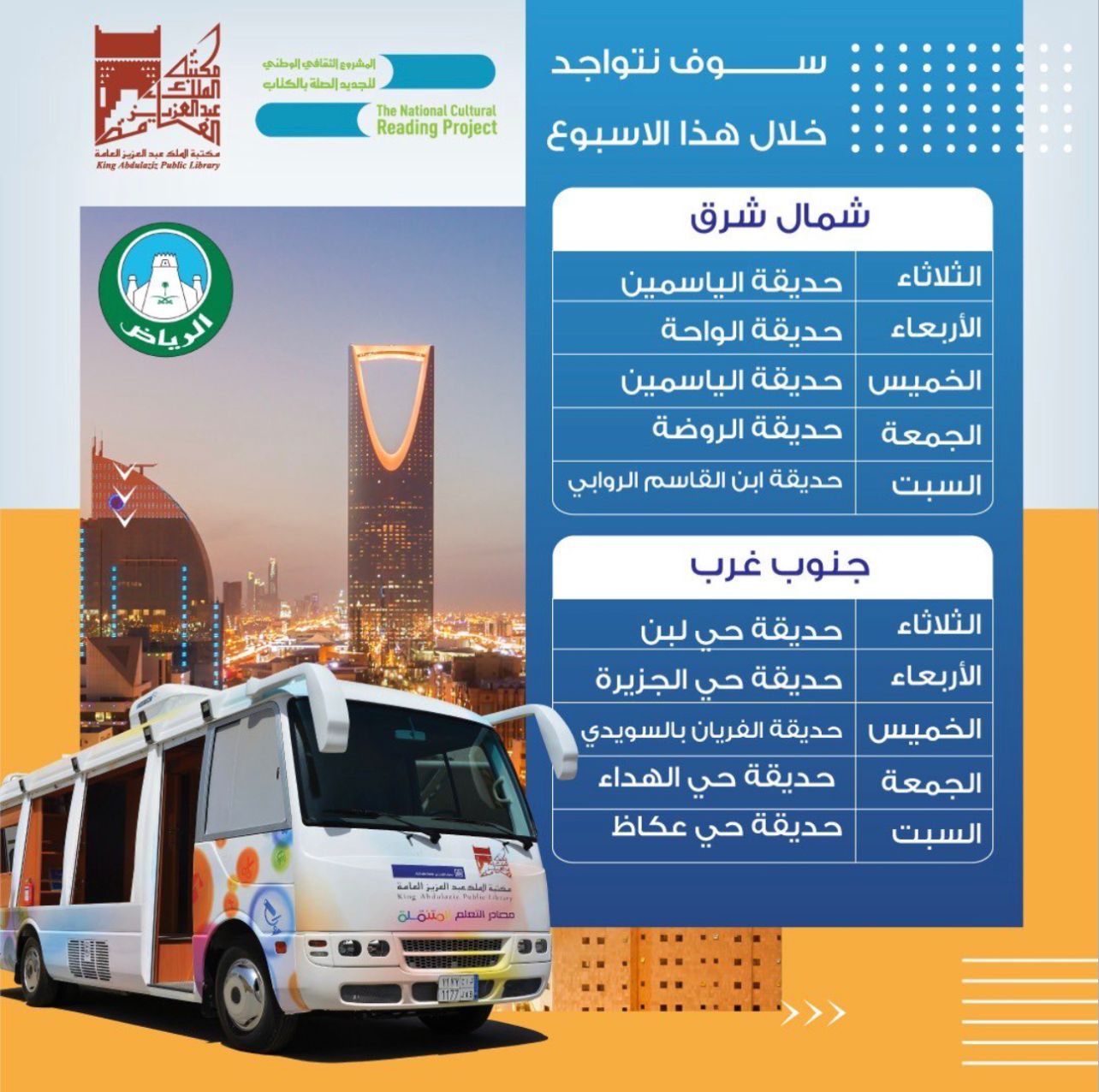 وعليه فأن الحافلتان تتواجد في ساحات البلدية بالرياض،للمستفيدين في المنتزهات والميداين، وذلك خلال خمسة أيام في الأسبوع.