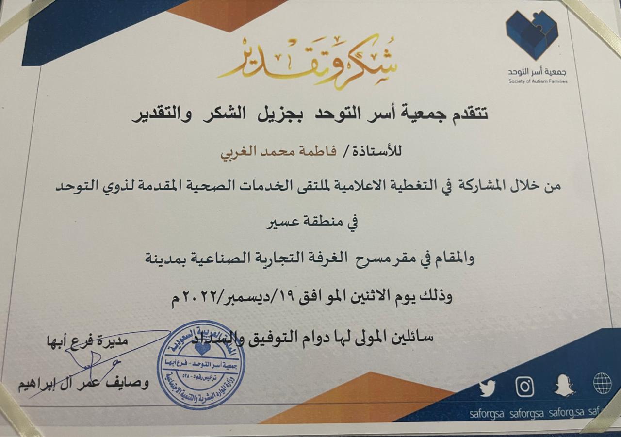 الشكر لمديرة جمعية أسر التوحد بمنطقة عسير فرع أبها الأستاذة وصايف عمر آل إبراهيم