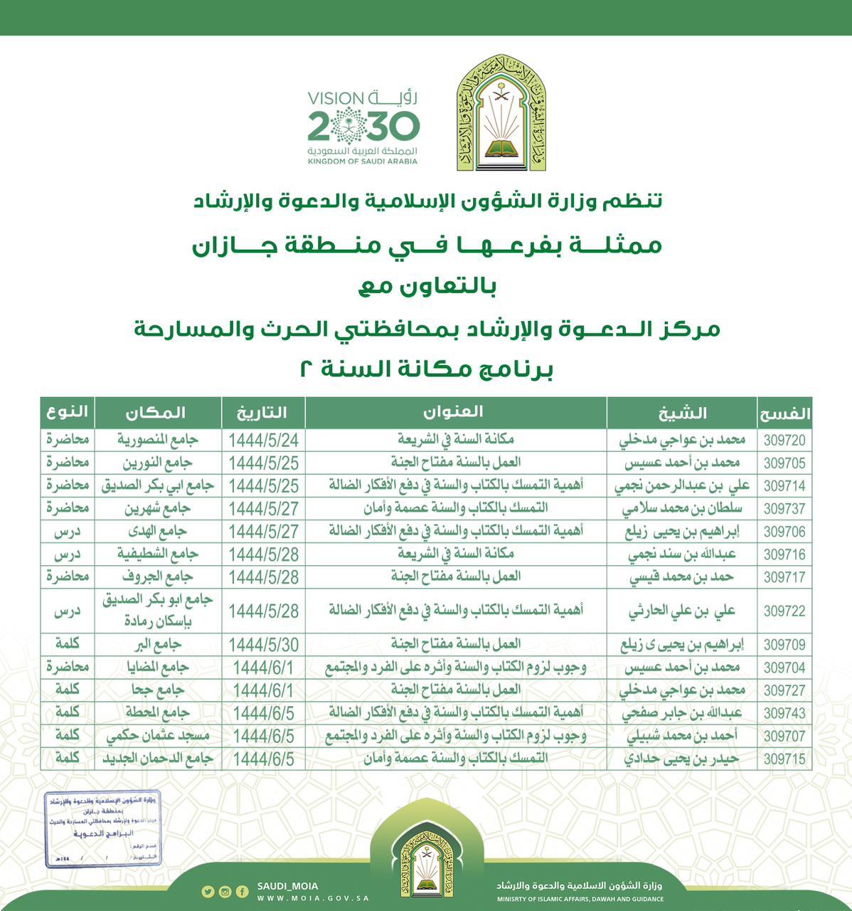 يواصل فرع وزارة الشؤون الإسلامية والدعوة والإرشاد بمنطقة جازان ممثلاً بمركز الدعوة والإرشاد بِمُحافظتي المسارحة والحُرّث تنفيذ محاضرات برنامج مكانة السنة 2 وذلك بِمُحافظتي أحد المسارحة والحُرّّث حيثُ ستُقام غداً الأربعاء الموافق 27 / 5 / 1444 هـ , بجامع شهرين محاضرة ” التمسك بالكتاب والسنة عصمة وأمان ” ويُقام أيضاً بجامع الهدى درس تحت عنوان ” أهمية التمسك بالكتاب والسنة في دفع الأفكار الضالة ” علماً بأن البرنامج انطلق مساء الأحد الماضي وتحدث عن مكانة السنة في الشريعة والعمل بالسنة مفتاح الجنة وسيواصل أيضاً في أيامه القادمه حديثه عن وجوب لزوم الكتاب والسنة وأثره على الفرد والمجتمع .