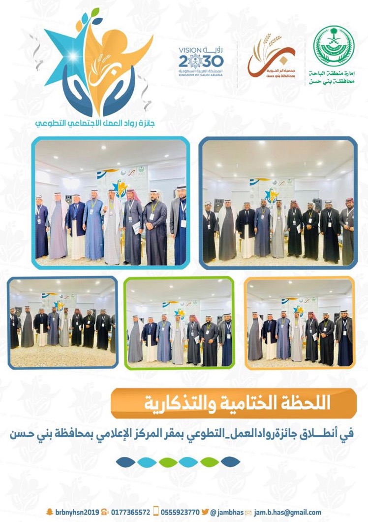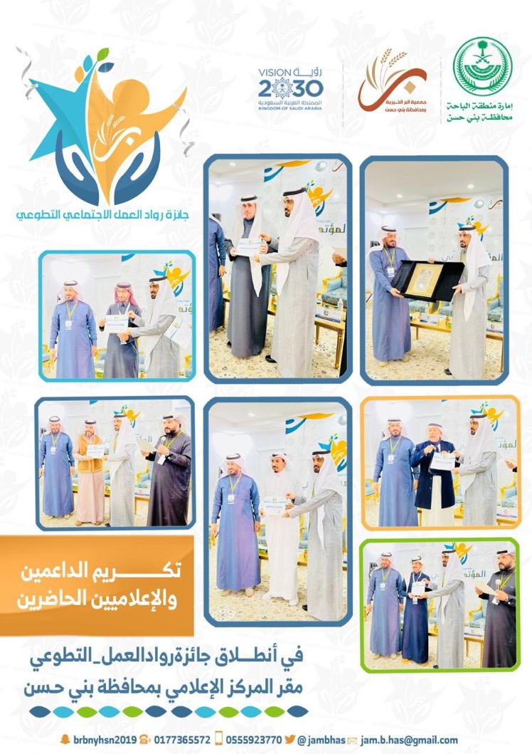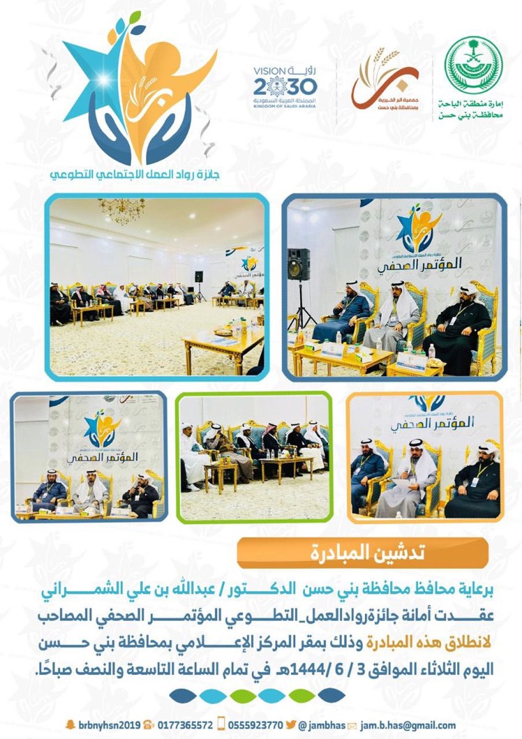 وأثناء المؤتمر قام رئيس مجلس إدارة جمعية البر الخيرية بمحافظة بني حسن الدكتور عبدالرحمن بن علي الشدوي المشرف العام على الجائزة بالتعريف بالجائزة وذكر أهدافها مُشيراً إلى أن الجمعية تسعى لاستقطاب أكبر عدد ممكن من المتطوعين ونشر ثقافة العمل التطوعي تمشياً مع رؤية المملكة ٢٠٣٠ مؤكداً على أهمية تشجيع الأشخاص البارزين والذين كان لهم أثر إيجابي في مجال العمل التطوعي الفكرة التي نشأت من خلالها هذه المبادرة والتي تم إطلاقها تحت مسمى جائزة رواد العمل الاجتماعي التطوعي والتي تسعى أمانة الجائزة من خلالها للوصول للغاية الأسمى وهي صناعة صف آخر من القادة في مجال العمل التطوعي في المجالات الخمسة التي تم تدشينها والعمل على تحقيقها وهي: