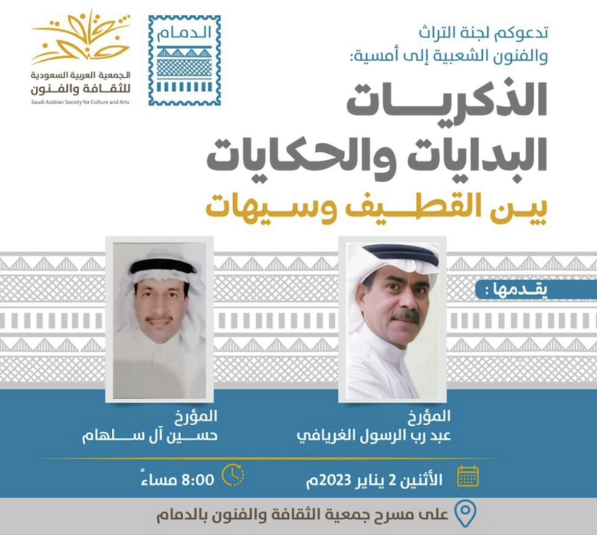 ينظم فرع جمعية الثقافة والفنون بالدمام بمشيئة الله تعالى في الساعة الثامنة والنصف من مساء يوم الاثنين القادم ٩ جمادى الاخرة ١٤٤٤ هـ – 2 يناير 2023 م أمسية الذكريات ( البدايات والحكايات…بين القطيف وسيهات ) يقدمها الأستاذ المؤرخ والباحث عبد رب الرسول بن علي الغريافي والأستاذ المؤرخ والباحث حسين بن حسن ال سلهام وهما من الباحثين والمهتمين بتراث وتاريخ مدينتي القطيف وسيهات والمنطقة الشرقية بشكل عام ولهما جهود فاعلة وواضحة وموفقة في هذا المجال .