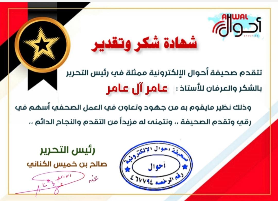 كرمت صحيفة أحوال الإلكترونية الإعلامي عامر آل عامر وذلك نظير مجهوداته وتميزه في تغطية المناسبات وعمله المتميز في مجال التحرير مما أسهم في تقدم ورقي الصحيفة.