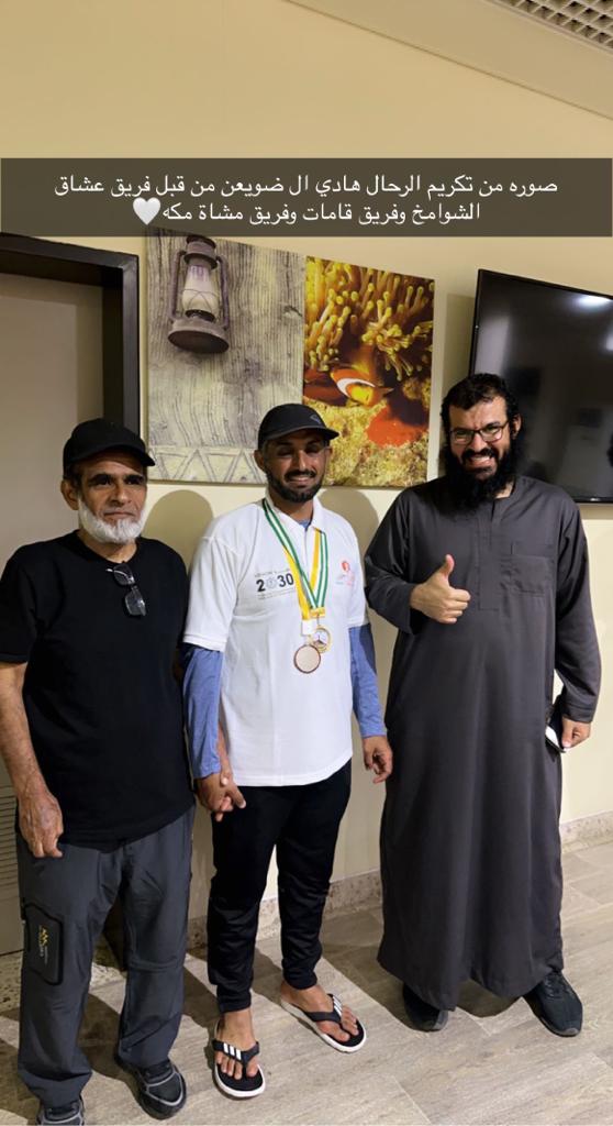وكان في استقباله مدير بيت الشباب بمدينة الملك عبدالعزيز الرياضية بمكة المكرمة ومجموعة من الفرق الرياضة يتقدمهم فريق مكة للمشي بقيادة الكابتن تركي الكراني، وفريق قامات بقيادة الكابتن يحيى الجابري، وفريق عشاق الشوامخ بقيادة الكابتن عبدالله عوض الزهراني.