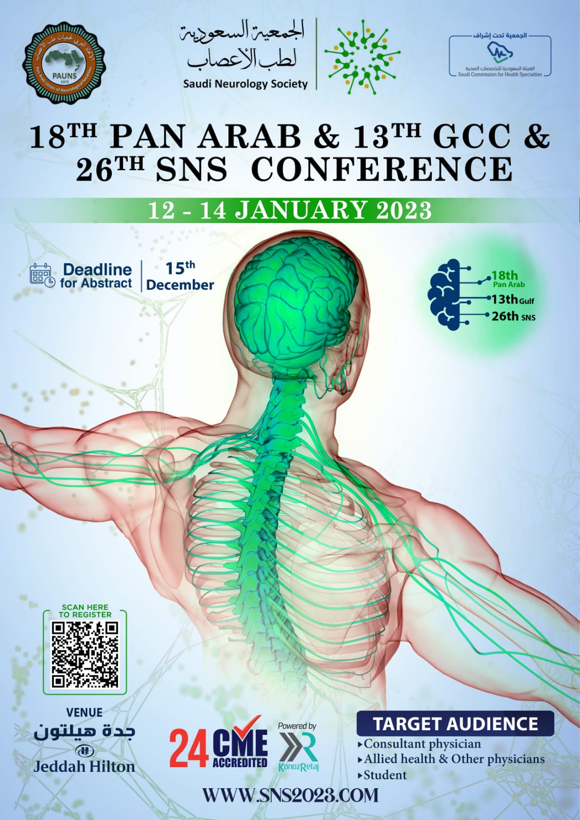 تقييم الجمعية السعودية لطب الأعصاب المؤتمر الثامن عشر للاتحاد العربي والثالث عشر الخليجي والسادس والعشرون السعودي لطب الأعصاب خلال الفترة من 12-14 يناير 2023 م في فندق الهيلتون بمدينة جدة حيث يشارك بالمؤتمر متحدثون من المملكه ومن بعض الدول العربية والدول الاجنبيه.