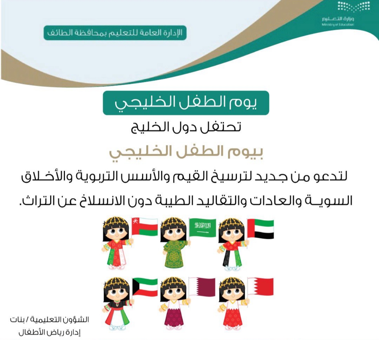 يشارك تعليم الطائف ممثًلا في إدارة رياض الأطفال في الاحتفال بـيوم الطفل الخليجي والذي يصادف الخامس عشر من يناير من كل عام، بعدد من الفعاليات التوعوية والتثقيفية.