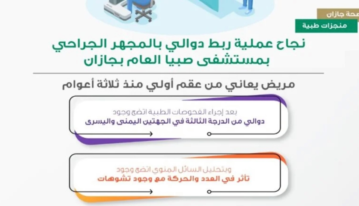 تمكن فريق المسالك البولية بمستشفى صبيا العام من إجراء عملية ربط دوالي بالمجهز الجراحي لمريض يعاني من عقم أولي.